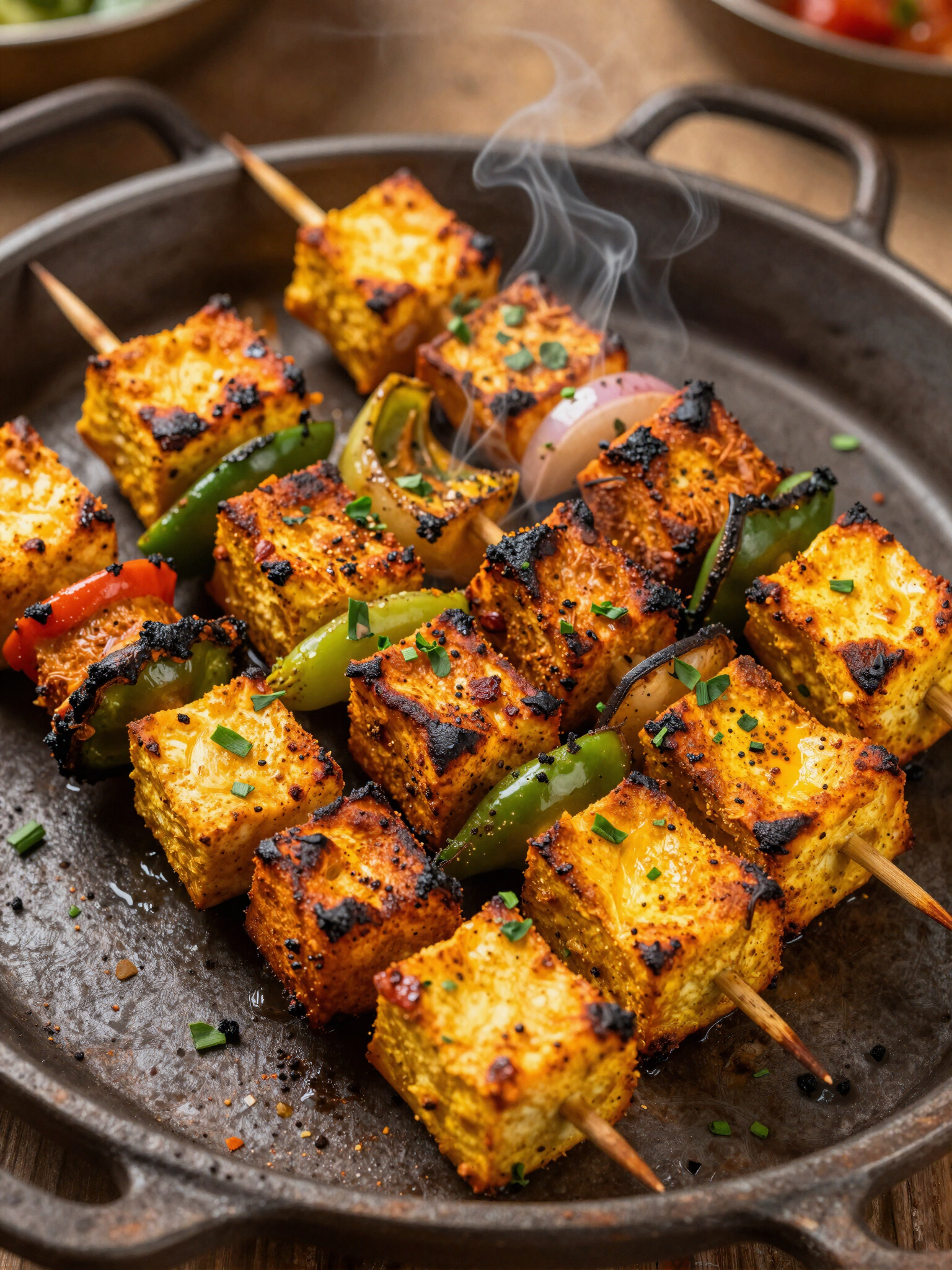 Marinated cottage cheese cubes grilled to perfection, served with a zesty, smoky, and tangy dipping sauce.