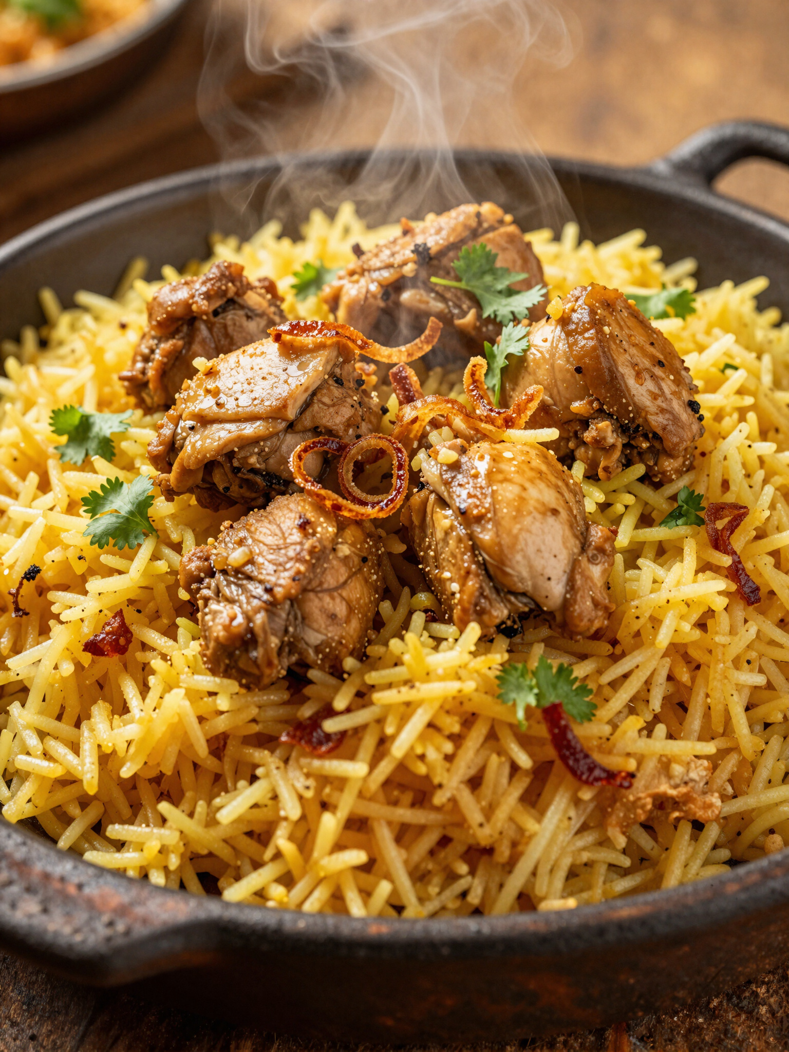 Slow-cooked aromatic rice layered with marinated chicken and saffron, finished with a golden, fragrant finish.